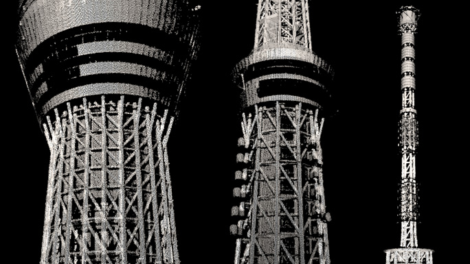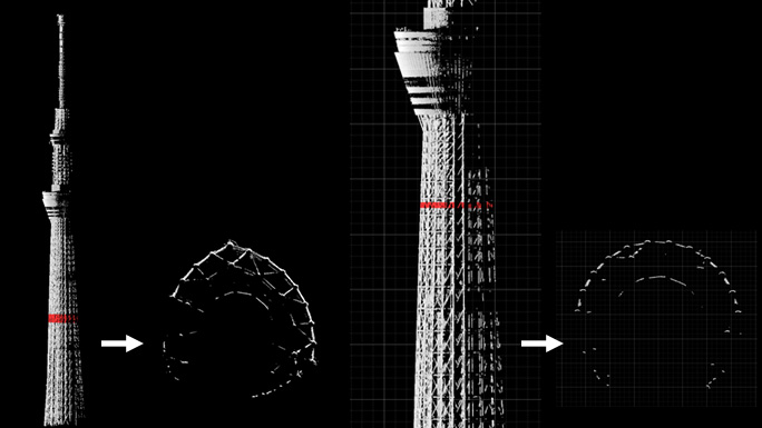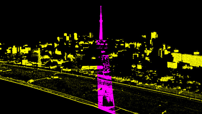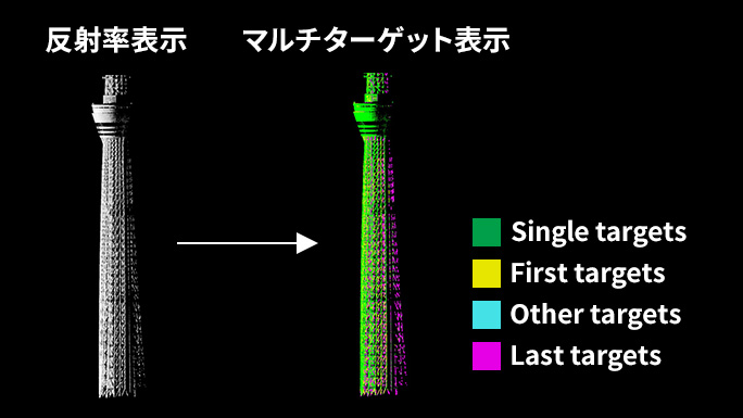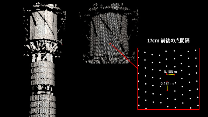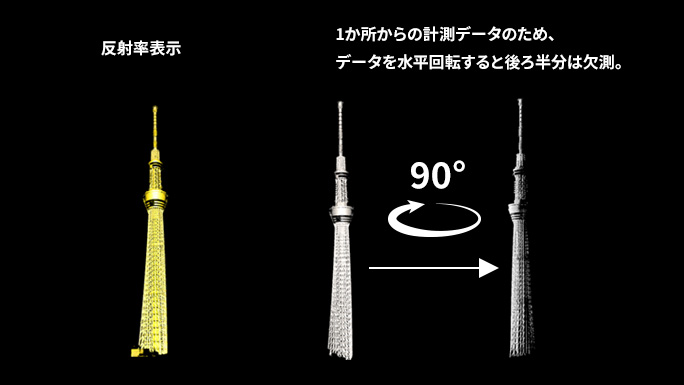 RIEGLスキャナの特長であるマルチターゲット測定機能により、 構造物の隙間をかすめた1発のビームが複数のリターンを返すことで、後ろ半分が部分的にデータ取得されていることが確認できます。